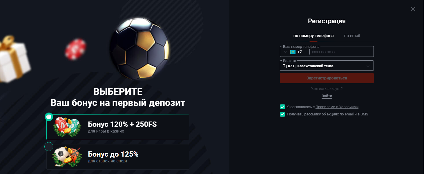 | 🎁 Максимальный бонус | до 120% к депозиту + 250 FS при пополнении от 10 000 тенге |
