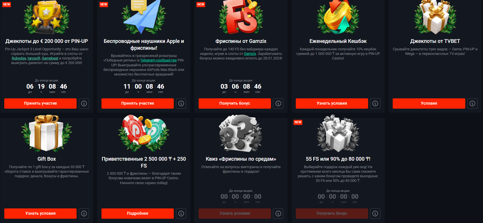 Дополнительные шансы на выигрыш зарегистрированные игроки Пин Ап казино могут получить путем участия в акциях и турнирах. Акции в клубе проводятся для стимуляции активности игроков. Поучаствовать в акциях гемблеры могут после выполнения определенных условий. Среди условий: