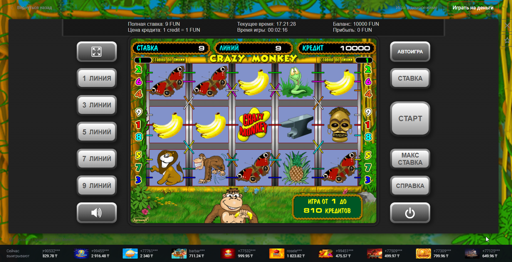 В отличие от некоторых игр казино, которые требуют загрузки, слот Crazy Monkey доступен для мгновенной игры. Игроки могут наслаждаться игрой прямо через свой веб-браузер, что избавляет их от необходимости загружать и устанавливать игру.